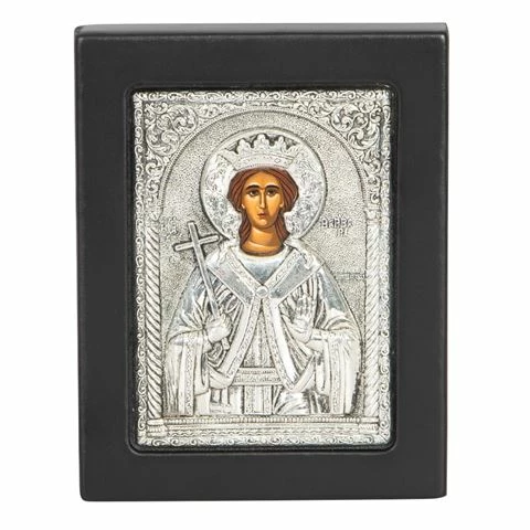 silver 925, while Saint Barbara’s face reflects authentic, hand-painted and ancient artwork. It is surrounded in a wooden style frame with a certificate of authenticity on the back.