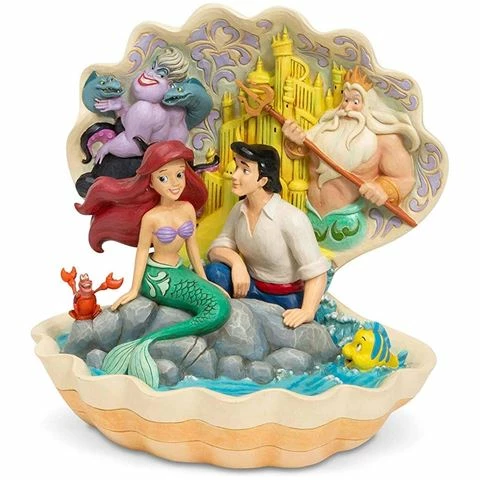 The Little Mermaid is a cherished Disney classic. This Jim Shore figurine has it all, the castle of Atlantica, King Triton, the villainous sea witch Ursula and her eels, Flounder, Sebastian, and Ariel and Eric. The lovers gaze into each other’s eyes.