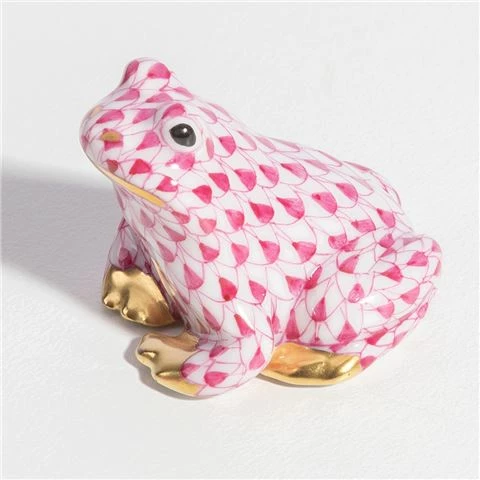 This Mini Sitting Frog ornament will melt your heart and warm your home. It’s been brought to life by the skilled hands of artisans crafting and painting these charming porcelain creatures. The famous Vieux Herend fishnet décor took form in 1858 when a Herend painter became inspired by a fishscale design he saw on a Chinese porcelain plate and painted a similar pattern onto a rooster figurine to imitate feathers. The fishnet design is now a Herend signature prized worldwide.