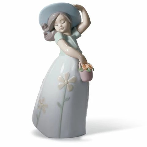 The Little Daisy Girl Figurine depicts a delightful spring lady, with her basket of flowers and her elegant wide-brimmed hat, and stands out for the purity of her form and her graceful pose.