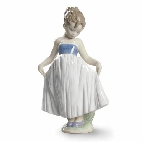 Look At My Dress Girl Figurine by Lladró depicts a girl holding her white and blue dress, along with her blue shoes.