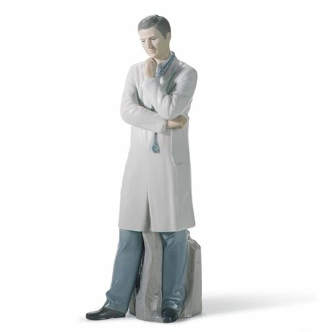 This porcelain piece by Lladro depicts a male doctor with a stethoscope hanging from his neck, wearing a white coat with blue trousers.