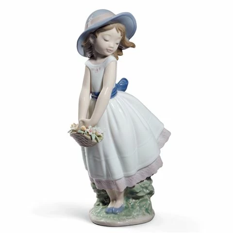 Sweet vision of childhood as an eternal spring in which life shines like a meadow in the sun. Elegant figurine of a girl holding a flower basket, decorated with soft colours and various shades of blue on the bow of the dress, shoes and hat.