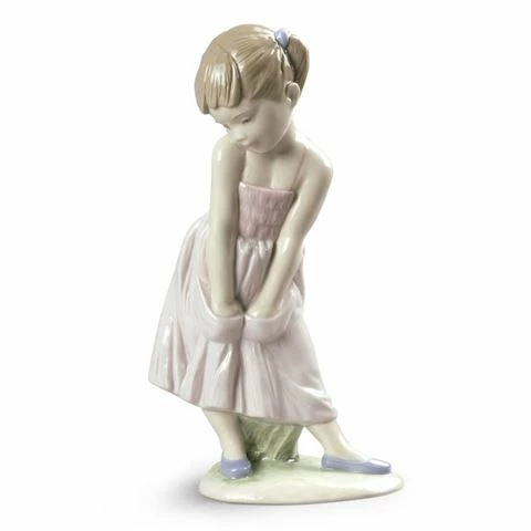 Sweet Shyness Figurine by Lladró depicts a shy girl looking at the floor, wearing a pastel pink dress.