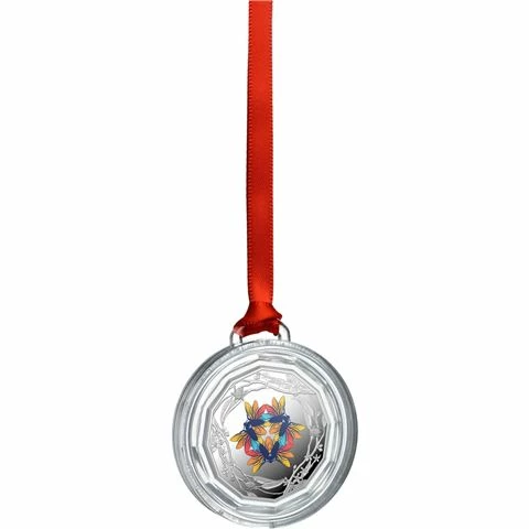 A luscious mandala of Christmas beetles printed in sparkling hyper metallic print are framed in detailed relief by a eucalyptus wreath adorned with beetles and native flowers. This stunning proof coin is housed in a hanging ornament capsule with red ribbon, allowing it to be hung on display during the festive season.