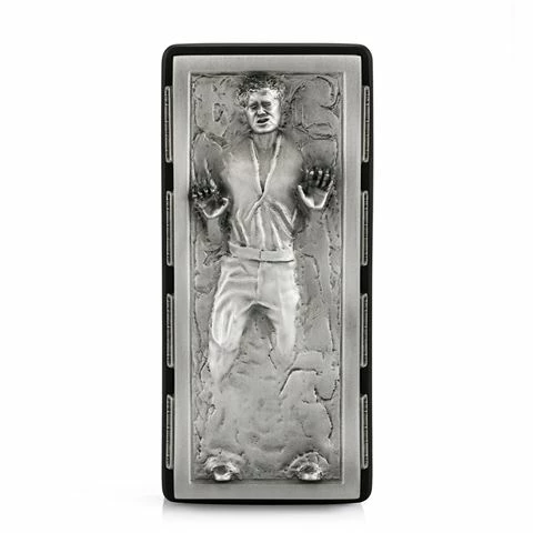 Reproduced in pewter, the lid features Solo encased in the carbonite matrix, the slab complete with its monitoring panels. Sized to accommodate business cards or writing instruments, the matt black bonded porcelain container draws from the film’s design language.