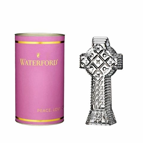 Artisans for Waterford’s illuminating Giftology collection have crafted a Celtic Cross in crystal with highly decorative cuts and packaged it in one of their adorable cylinders, highlighted with gold and embellished with the words Peace, Love, Crystal.