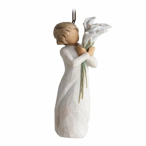 Willow Tree’s Beautiful Wishes ornament perfectly captures the spirit of good will. The gracious figure carries in her arms a bunch of white calla lilies – a symbol of love. Her earnest pose underlines this figurine’s intent, which is to bring love, health and happiness to you.